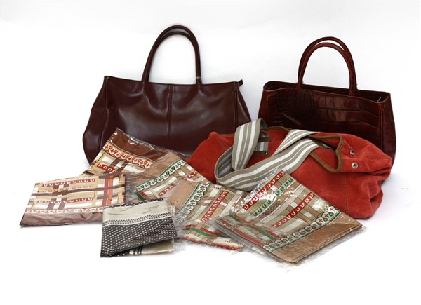 Lotto composto da due borse a braccio nei toni del bordeaux e una capiente borsa in camoscio rosa unita a sei foulard di diverse dimensioni e colori (lievissimi difetti)