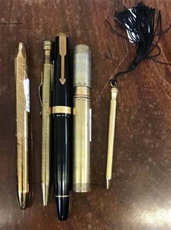 Lotto di cinque tra penne, lapis e portamine, tra cui una stilografica Parker (difetti e segni d'uso)