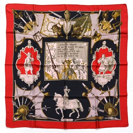 HERMÈS Foulard in seta "Armeria", Philippe Ledoux 1966, fondo nero bordo rosso