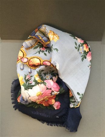VALENTINO Granfoulard in lanetta a tema gloreale, fondo azzurro polvere, bordo