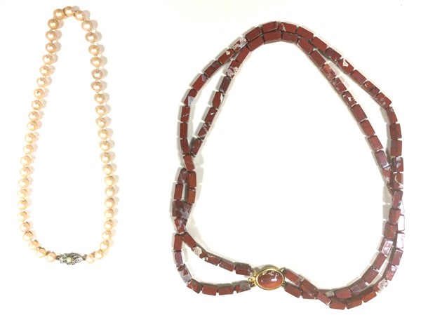 Lotto composto da una collana di perle fancy con chiusura in argento e una collana di due fili di parallelepipedi in pietra dura, chiusura in argento dorato
