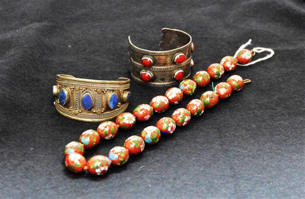 Lotto di bigiotteria etnica composto da due bracciali rigidi in metallo argentato con pietre dure e una collana di sfere ovoidali cloisonné