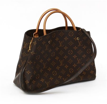 Borsa a braccio con tracolla in tela Monogram con dettagli in vacchetta. Numero di serie e lucchetto