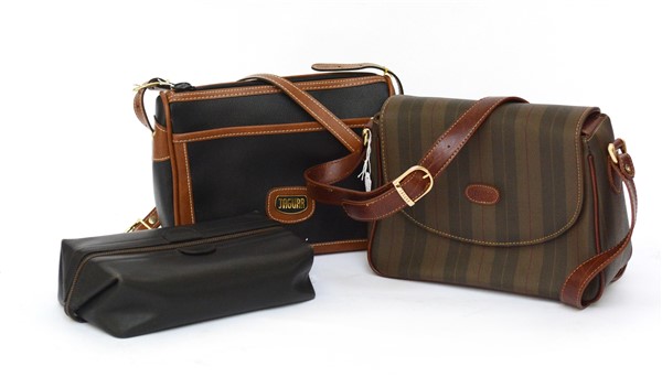 Lotto composto da due borse a tracolla in tela plastificata e cuoio e una trousse da toilette da uomo in pelle (difetti e segni d'uso)