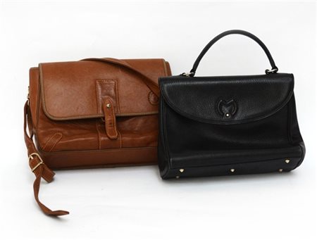 Lotto composto da due borse: una in cuoio a tracolla, dettagli logati in metallo color oro; l'altra a braccio in pelle martellata nera con tracolla, patella logata (segni d'uso)