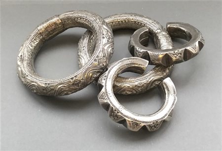Lotto composto da quattro bracciali etnici in argento sbalzati a mano di cui due "sonori"
