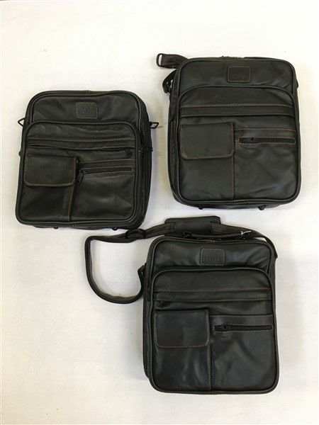 Lotto di tre borselli unisex portadocumenti in pelle, tracolla staccabile, di cui due nuovi (lievi segni d'uso)