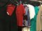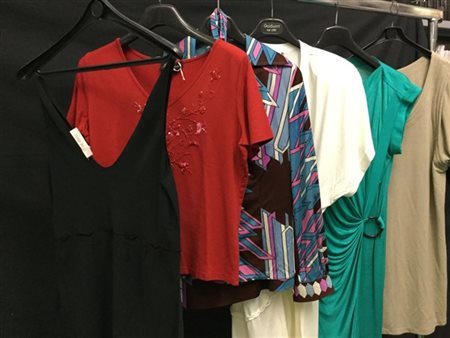 Lotto composto da tre vestiti in maglia di diversi colori, un completo camicia con gonna, un top nero e una maglia rossa con ricamo di perline e paillettes ton-sur-ton (tg. 4242/48) (difetti e segni d'uso)