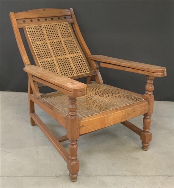 Sedia a sdraio in legno con braccioli allungabili, montanti e piedi anteriori torniti, seduta e schienale in paglia di Vienna. Fine secolo XIX (difetti e rotture)