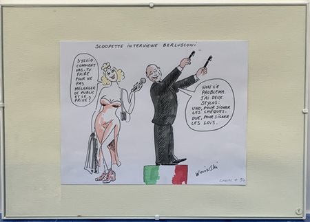 Due vignette satiriche, pennarello e acquerello su carta, di cui una raffigurante Scoopette che intervista Silvio Berlusconi