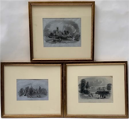 Tre stampe da matrici in acciaio raffiguranti vedute inglesi (cm 10,5x16). In c