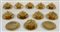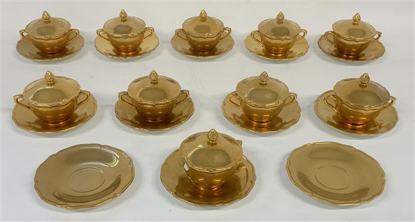 Manifattura Este. Lotto di dieci tazze biansate con coperchio e dodici piattini a bordo mistilineo in ceramica dorata (difetti e mancanze)