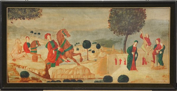 "Scena medievale" tecnica mista su tela applicata su tavola (cm 82x178), firmato in basso a destra