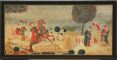 Firma indecifrata "Scena medievale" tecnica mista su tela applicata su tavola (c