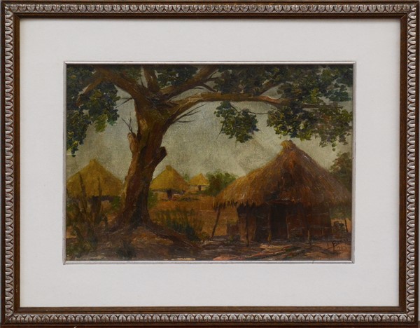 "Capanne" 1945, olio su cartone telato (cm 25x35) firmato e datato in basso a destra, in cornice