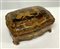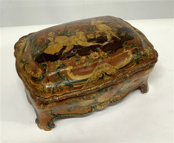 Scatola di forma mossa in legno laccato e dorato a figure in un paesaggio (cm 25x13x29) (difetti)