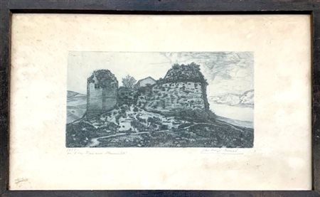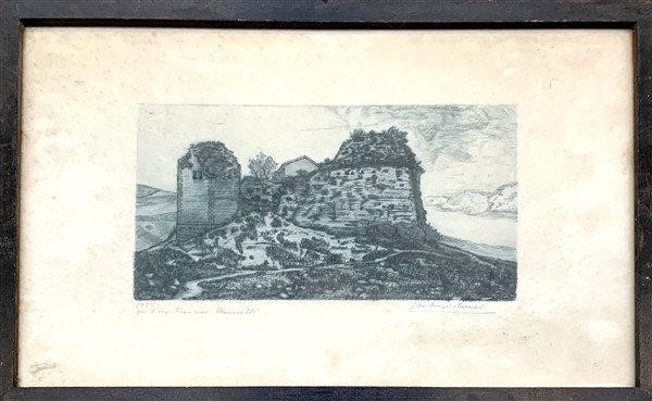 Firma indecifrata "Paesaggio con ruderi" acquaforte (cm 33x47) firmata in basso a destra e dedicata in basso a sinistra, datata 1925. in cornice (difetti)