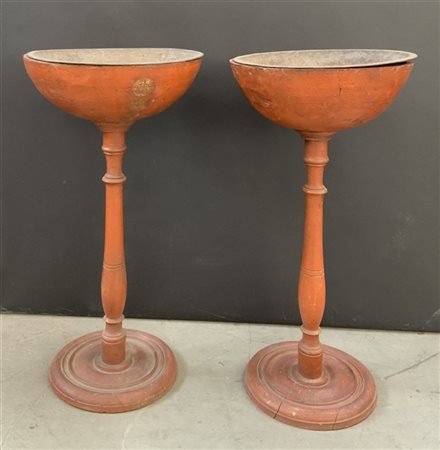 Coppia di bracieri circolari in legno laccato rosso con gamba tornita (h cm 69) (difetti)