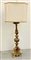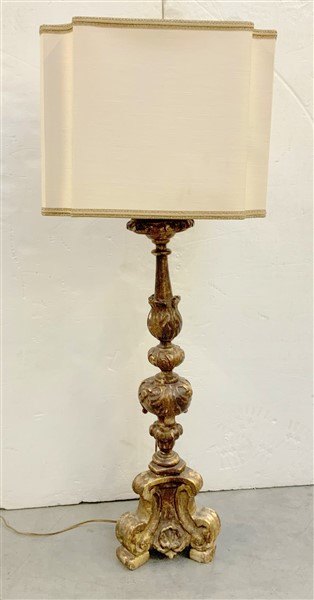 Candeliere tripode in legno intagliato e dorato a foglie e volute (h. cm 80) (difetti e restauri) Montato a luce elettrica