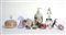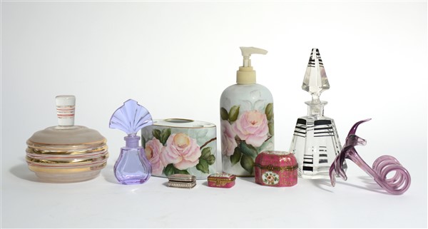 Lotto composto da cinque accessori da toilette in cristallo e porcellana dipinta, un fiore d'appoggio in vetro soffiato, due porta pillole in porcellana marcate Limoges e uno in argento (difetti)