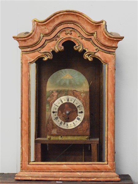 Movimento di grande orologio musicale inglese montato su quadrante di epoca posteriore. In cassa di legno marmorizzata.