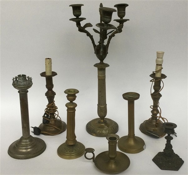 Lotto composto da otto candelieri in ottone, bronzo e altri materiali. Misure e decori diversi (difetti)