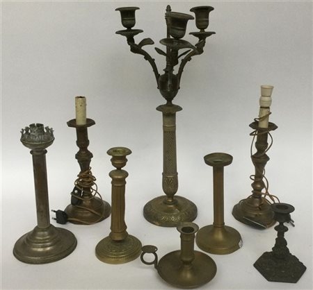 Lotto composto da otto candelieri in ottone, bronzo e altri materiali. Misure e