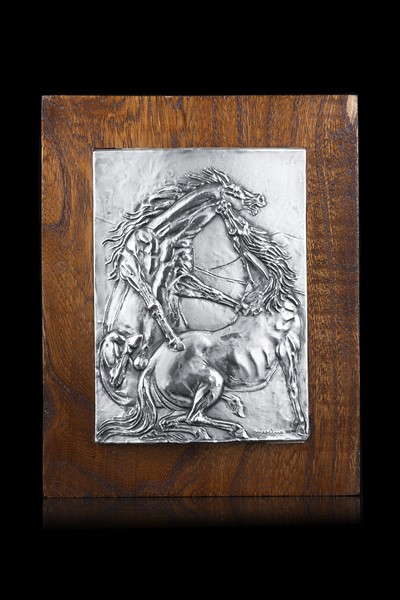 "Horses" silver plaque on a wood base (23x9,5 cm) signed and numbered 43/150 (slight defects)