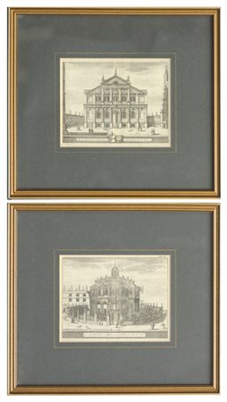 Coppia di incisioni (da matrici in acciaio) raffiguranti "Vue du theatre de Sheldon à Oxford" (cm 13x16 circa). Al verso etichetta relativa alla provenienza "Magna Gallery". In cornici (lievi difetti)