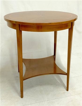 Tavolino da centro lastronato e filettato in noce, gambe dritte e rastremate riunite da pianetto sagomato (cm 65x68) (lievi difetti)