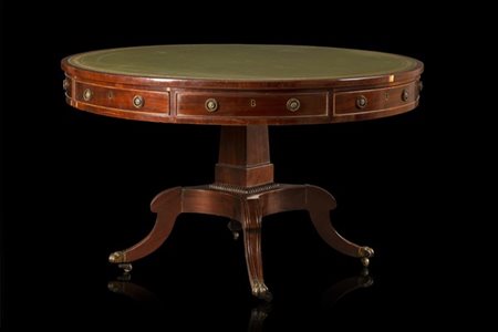 Tavolo tondo da gioco lastronato in mogano? a quattro cassetti nella fascia. maniglieria e bocchette in bronzo dorato. Gamba centrale a colonna terminante a quattro piedi a rotelle. Piano in pelle verde impressa (cm 122x72) (difetti e restauri)