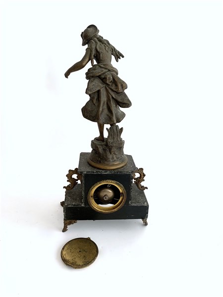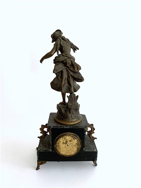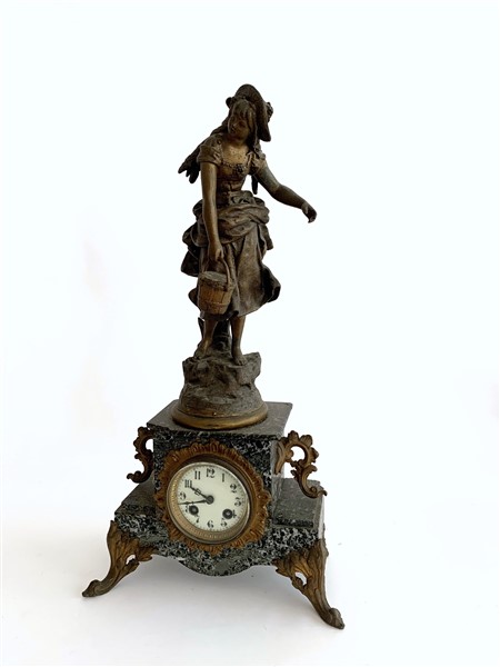 Pendola in marmo e antimonio decorata da figura femminile a tuttotondo.