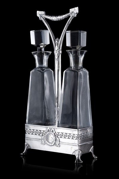 Cruet in argento a fascia traforata, piedi fogliati, presa decorata a ghirlanda. Due ampolle con tappo in cristallo (h. cm 22,5) (g 70) (lievi difetti)