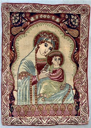 Tappeto Keshan, Persia, inizio secolo XX. Decoro pittorico raffigurante Madonna con Bambino, bordura con decoro a meandro su fondo bianco (cm 82x59) (lievi difetti)