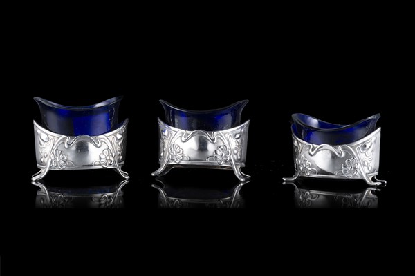 Tre saliere in argento sbalzato a fiori e frutti, piedi mossi, con vaschette in vetro blu (cm 4,5x5,5) (g netti 60)