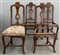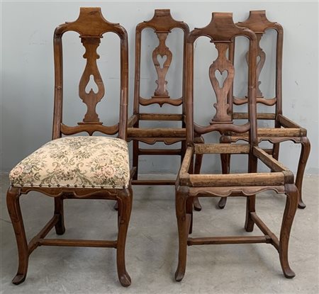 Gruppo di quattro sedie con schienale traforato e gambe mosse riunite da traversa. Inghilterra sec. XIX (difetti e mancanze)