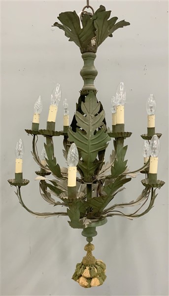 Lampadario a dodici luci con struttura in metallo laccato decorato a foglie (h. cm 80) (difetti)