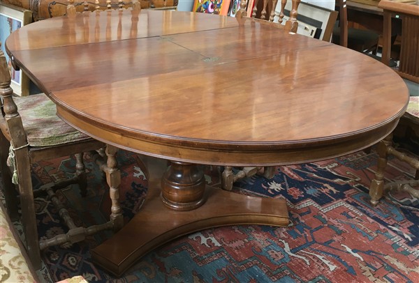 Tavolo da pranzo con piano tondo allungabile, gamba centrale tornita poggiante