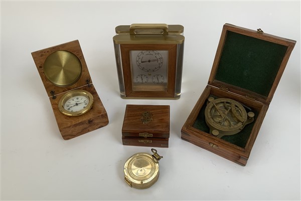 Lotto composto da un quadrante solare in ottone con bussola in custodia, una bussola da rilevamento in custodia, una stazione barometrica e un orologio da tavolo al quarzo. Secolo XX (difetti)