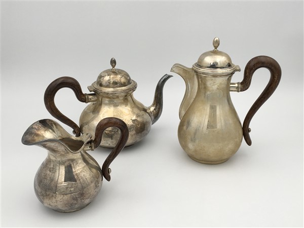 Parte di servizio da tè e caffè in argento a corpo liscio con anse in legno sag