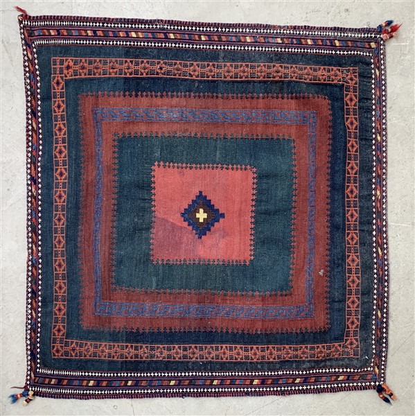 Tappeto Sofreh, Persia, inizio secolo XX. Decoro a quadrati concentrici con piccolo medaglione romboidale, bordi decorati con tecnica djadjin. In origine utilizzato come tovaglia nelle tende nomadi del Sud della Persia (cm 102x102) (difetti e macchie)