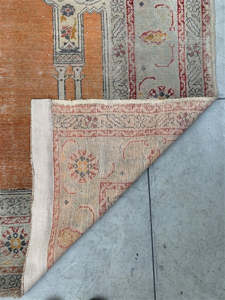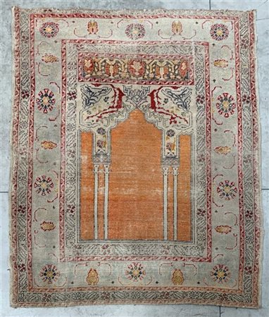 Tappeto preghiera Jorghes, Anatolia, secolo XX. Mirab a fondo salmone con coppia di colonne bifore. Bordura Herati (Difetti, rapature e mancanze) (cm 150x126)
