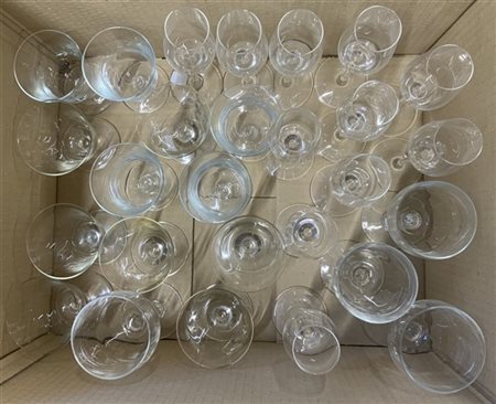 Cartone contenente parte di servizi differenti di bicchieri in vetro incolore, composto da bicchieri da acqua di varie misure e calici (lievi difetti)