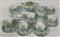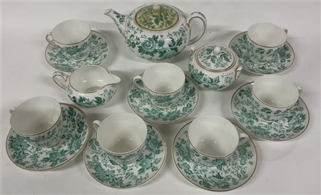 Manifattura di Wedgwood, parte di servizio da the in porcellana con decoro floreale monocromo verde, composto da sette tazze con otto piattini, teiera, lattiera e zuccheriera. (difetti e restauri)