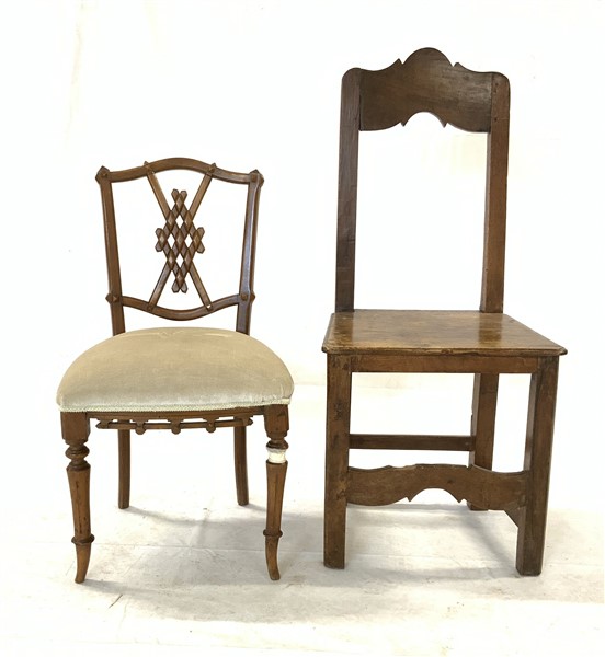 Lotto composto da due sedie diverse, una da balia con schienale a giorno intagliato a losanghe, e un'altra rustica (difetti)