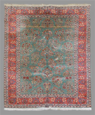Tappeto Sparta, Anatolia, secolo XX. Decoro all over floreale policromo su fondo verde. Cartiglio con iscrizione islamica (Difetti abrash) (cm 287x199)