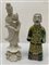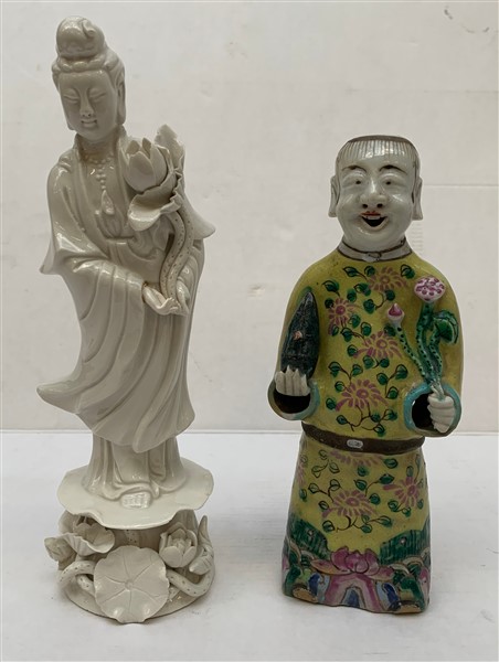 Lotto composto da una figura in blanc de chine raffigurante dama con fiore di loto e una maschile in porcellana policroma (difetti)