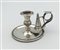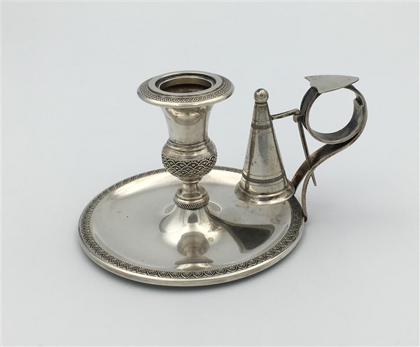 Bugia in argento con spegnimoccolo, bordure decorate a palmette, ansa incisa a
