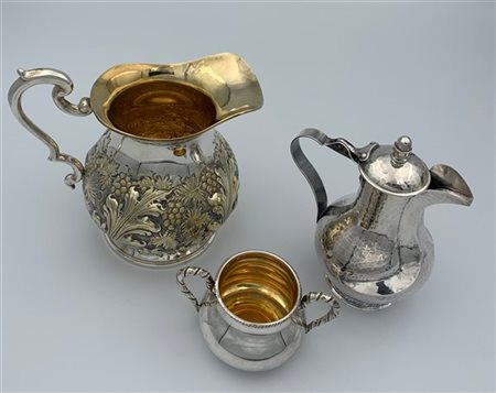 Lotto composto da una brocca, una caffettiera e una zuccheriera in argento e vermeille di diverso decoro. Titolo 800. Manifatture differenti (mancanze) (g 1000)