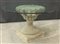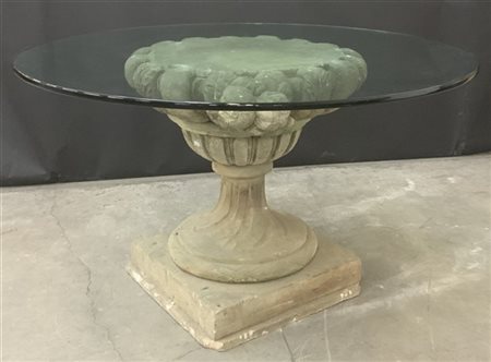 Base in pietra composta da tre elementi: una base quadrata, un elemento centrale a forma di coppa ed un elemento superiore di forma circolare decorato a baccellature e motivi vegetali e frutti. Piano in cristallo (d cm 139, h cm 80) (difetti e rotture)